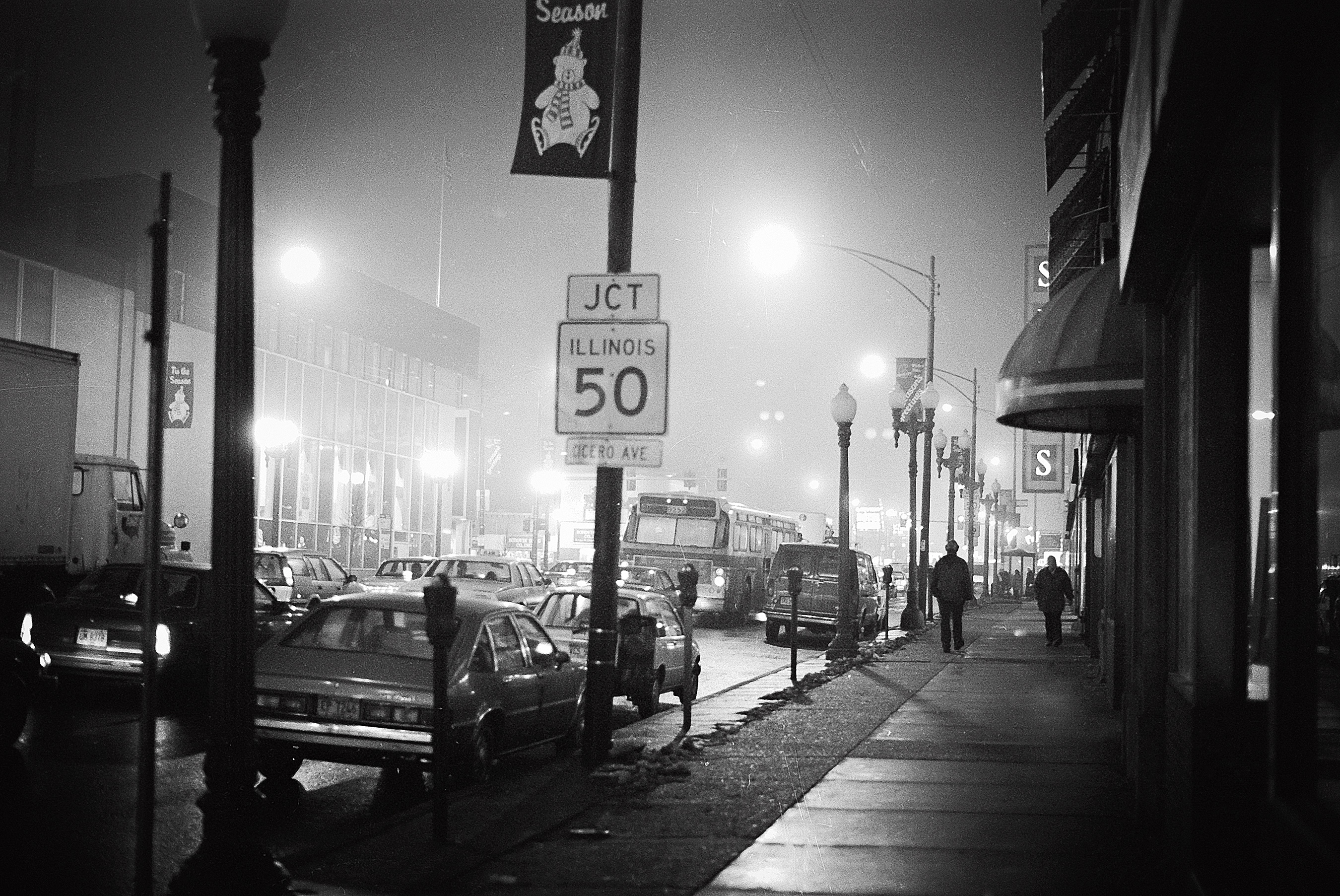 In Chicago, the area of Portage Park where the intersections of Irving Park Rd., Cicero Avenue and Milwaukee Avenue meet is traditionally known as 6 Corners. Some people out there will immediately argue and claim Milwaukee/Damen/North Avenue as 6 Corners– It is not! In my forty plus years on this earth, it’s always the area on the Northwest side of the city by where the (former site) Sears is located. This photo was taken on a foggy evening in December 1995.